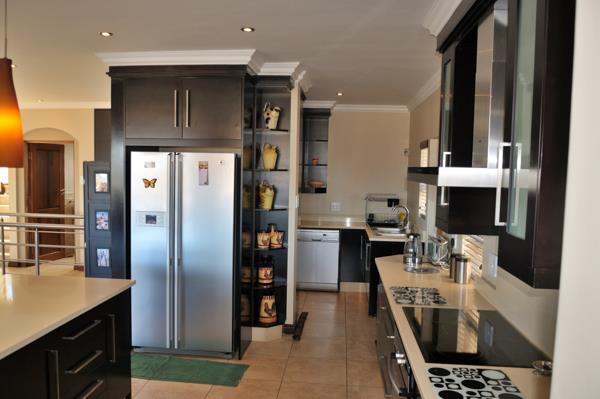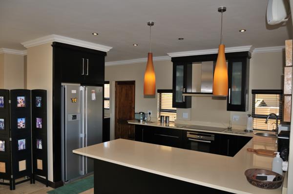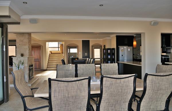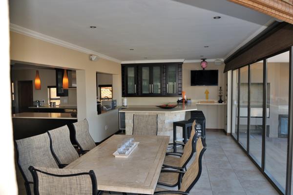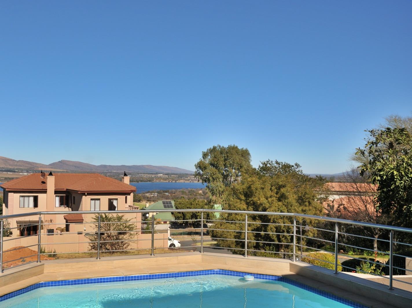 Lavish Family home fully furnished. Open plan living with breathtaking views of the dam. All the entertainment areas open onto a patio with stacking doors. Decked balcony with pool. 2 lounges and a fully equipped bar with fridges. Kitchen is well equipped with all top end appliances. 4 bedrooms all with modern en-suite bathrooms , 3 garages and staff accommodation make this home ideal for a family, lock up and go, low maintenance. Fully airconditioned pet friendly.