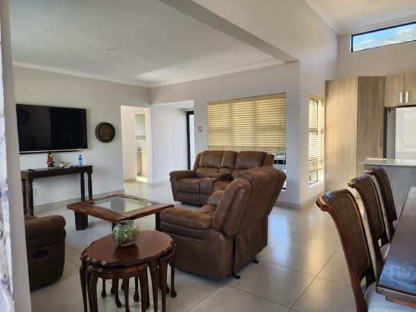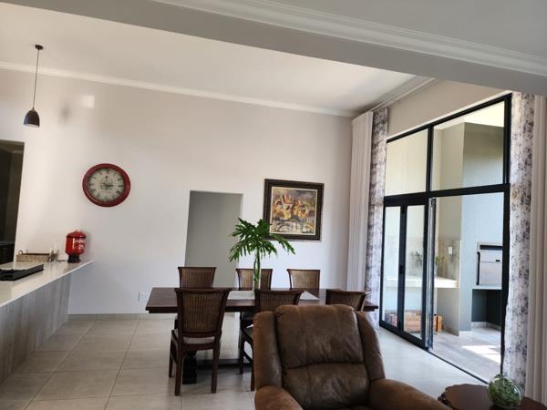 Double lock up garage, 3 bedroom, 3 bathroom, open plan kitchen, lounge, dining areas and a study corner makes the home complete. The covered braai area plus a right sized pool on the side, enhances the entertainment experience in the home.