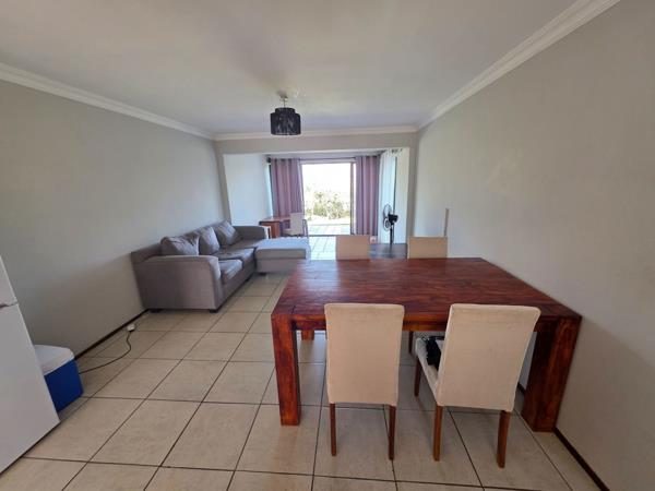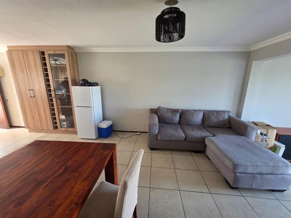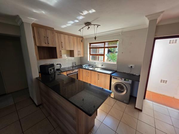 The contemporary kitchen flows seamlessly into the living area, which in turn opens onto an enclosed patio perfect for use as a dining space or sunny reading nook. Large sliding doors lead from the patio to a private braai area, ideal for entertaining or relaxing with friends and family.