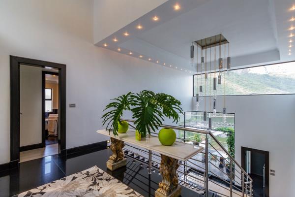 From the moment you step through its imposing glass entrance, you are enveloped in an aura of grandeur and sophistication. The dazzling interplay of sparkling downlights, a shimmering crystal chandelier, bold architectural lines and vibrant accents create an unforgettable welcome. Every element of this residence has been designed to evoke a sense of opulence, while the sweeping 180-degree views of the Hartbeespoort Dam elevate it to a truly rare offering.