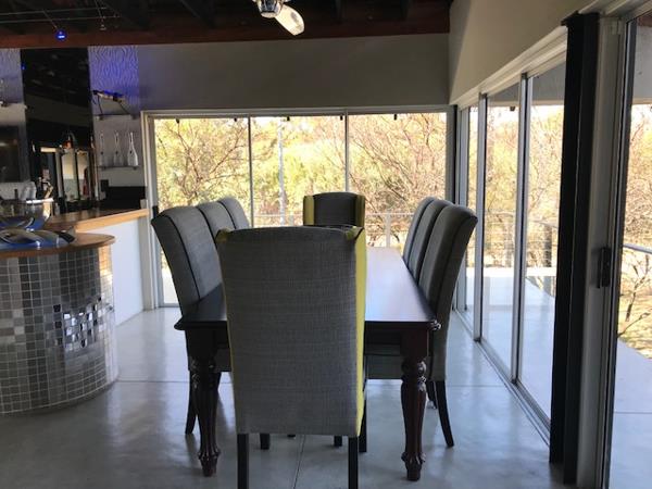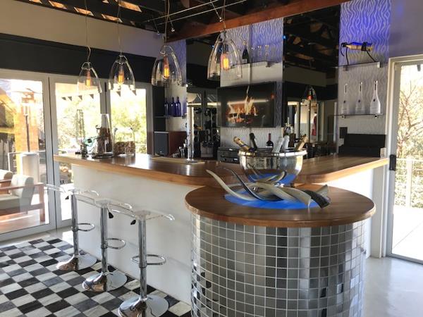 The open plan kitchen is industrial and modern with a hint of zebra. There are 2 kitchens, one formal and one informal for those days when entertaining on a large scale. To this end there are also 2 bars. One super high tech in the main house and one inside the pool ( with a flat screen TV of course). On that subject it also has a soundproof cinema with leather recliners. The house wraps around the entertainment area and also has a superb cottage with a kitchen, lounge and patio. Here also, no cost was spared on the finishes which are simply perfect.