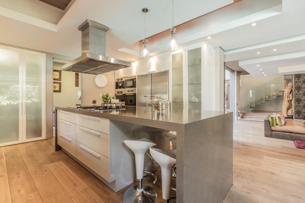 The kitchen is modern and features Miele appliances, ensuring that meals are prepared to the highest standard. The folding doors in the kitchen open up to the gorgeous gardens, allowing for easy access to the outdoor entertainment areas.