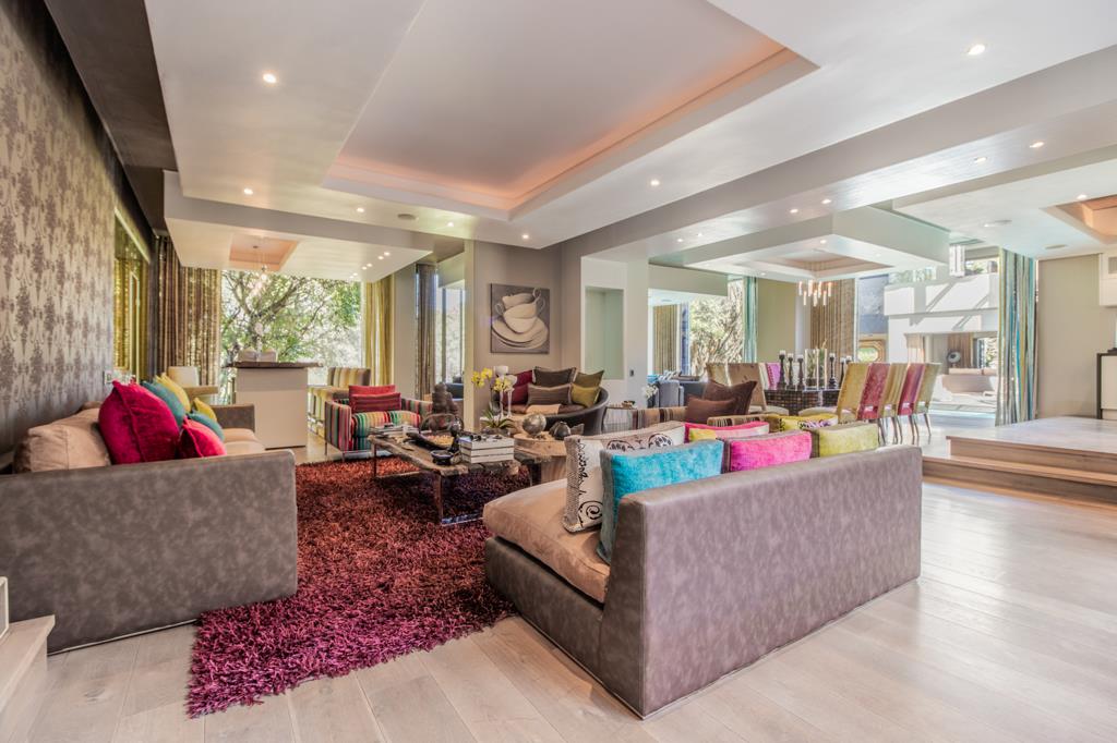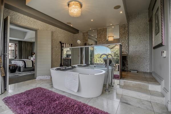 The luxurious African-Bali -style home is located in Hartbeespoort Dam, offering breathtaking views of the surrounding mountains and the dam. The entrance to the home is truly magnificent, with a triple volume Porte couche leading into the grand entrance hall.
