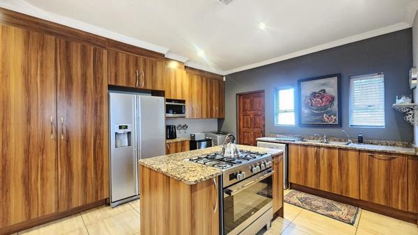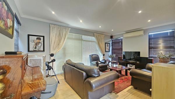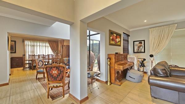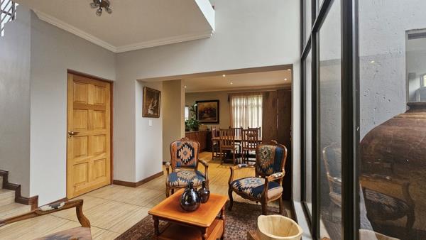 As you enter. You are greeted by a soaring high-volume ceiling that instantly creates a sense of space and openness. The entrance hall flows seamlessly to the dining area, modern kitchen with island, and an enclosed patio with a built-in braai, Stacking doors from the patio open onto a sparkling pool and a manicured garden, perfect for entertaining or relaxing outdoors.