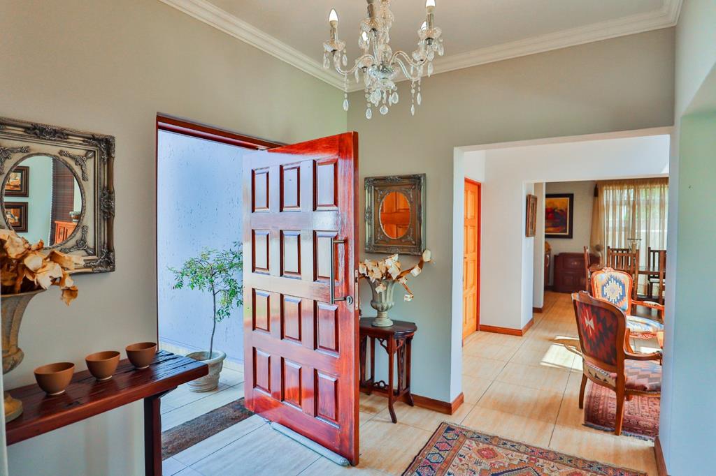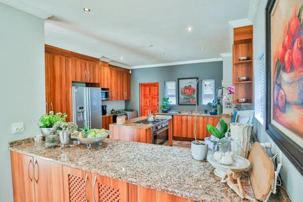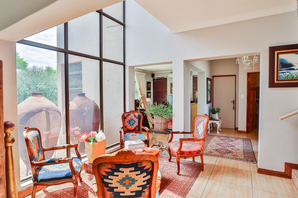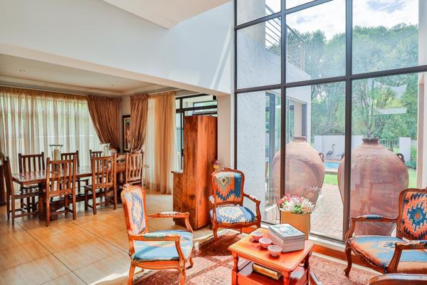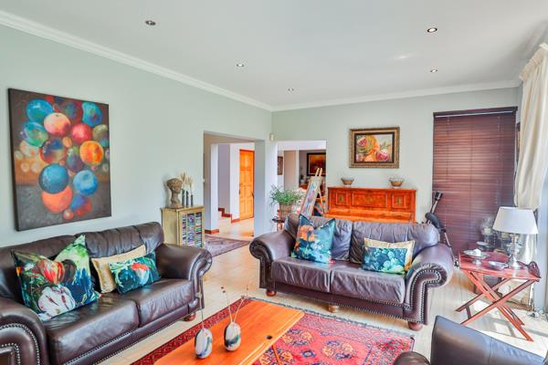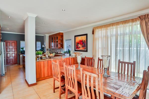 Perfect condition, wonderful ambience, enough space for the whole family. The 4 bedrooms, all upstairs, have sliding doors, ample cupboard space, natural light with views. The 3 bathrooms mes and guest cloakroom downstairs add to the functional flow of this exciting home. It offers a spacious entrance hall, lounge with access to the garden and pool, a smaller lounge area, open plan dining and farmsize kitchen, plus a braairoom with stacking doors. A double garage completes the picture.