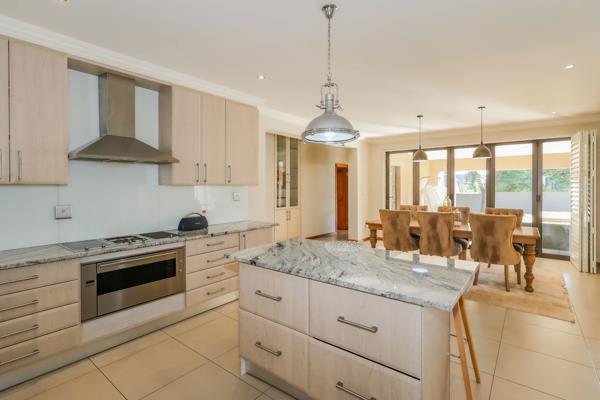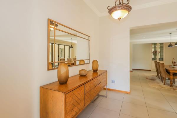 The entrance hall leads to the open-plan dining room, kitchen and lounge area. Stack doors open to a covered patio and the swimming pool.