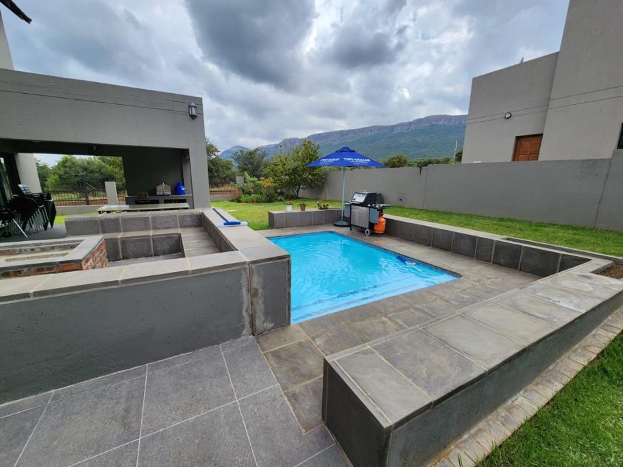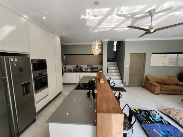 Offering you a combination of functional, elegant design with breathtaking mountain views, this three-bedroom home has stylish finishes and open plan seamless flows. The kitchen is modern Duco design with a central island, Whirlpool ovens and electric hob. The three recreational areas lead, with stacking doors, onto the stunning entertainment area which comprises a covered patio, built in braai and sparkling swimming pool in a huge enclosed garden with established plants including a peach tree.