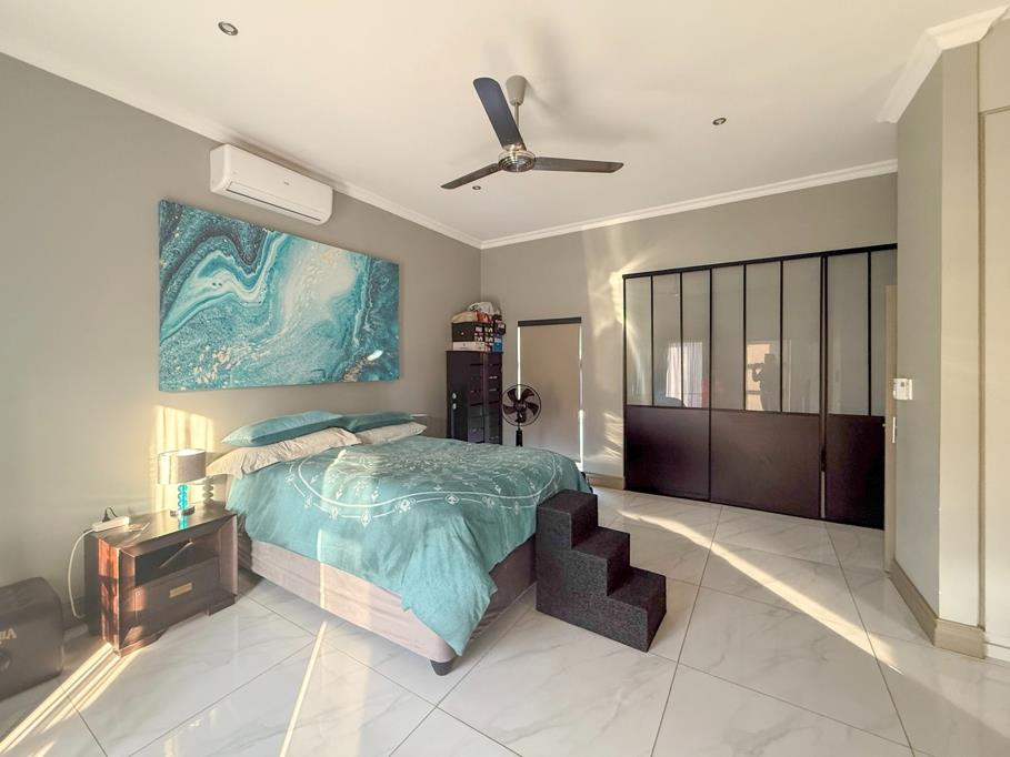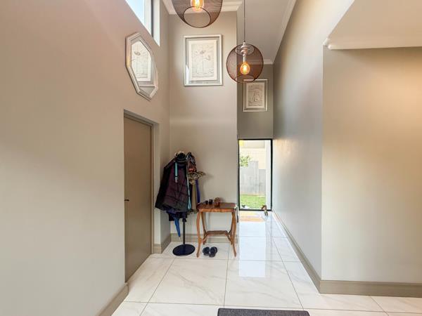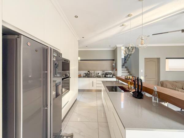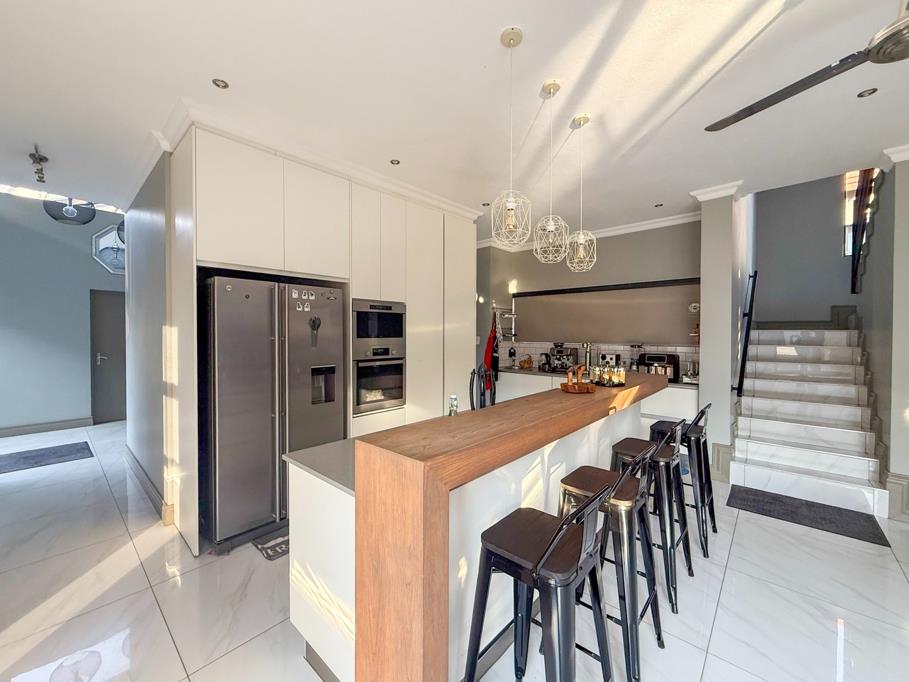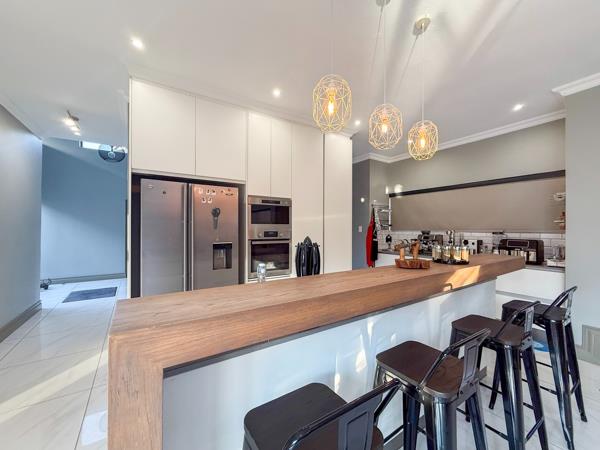 Step inside to find light-filled open-plan living areas, including a family/TV room, an elegant entrance hall, and a well-appointed kitchen complete with a pantry and scullery. Entertaining is a dream with a covered patio featuring a built-in braai, a boma area for cosy evenings around the fire, and a sparkling swimming pool with a tranquil water feature that adds a touch of luxury to the garden. Upstairs, the home offers three spacious bedrooms with built-in cupboards including a main en-suite along with a guest toilet, domestic accommodation, and a double garage. Quality finishes, a fireplace, air-conditioning, and backup water and solar systems ensure year-round convenience and peace of mind.