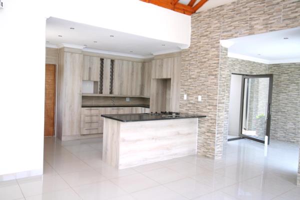 Large open-plan living area and kitchen, with high ceilings, walking out onto an enclosed bar/braai area. 3 Well-sized sunny bedrooms with the main being en-suite. The other two share a full modern bathroom. 2 Automated garages with direct access to the house. There are also 2 covered parkings in front of the house. Outside is a lovely patio overlooking the mountains around. This is ideal for sundowners. There is an Irrigation system in the garden which is enclosed for pets.