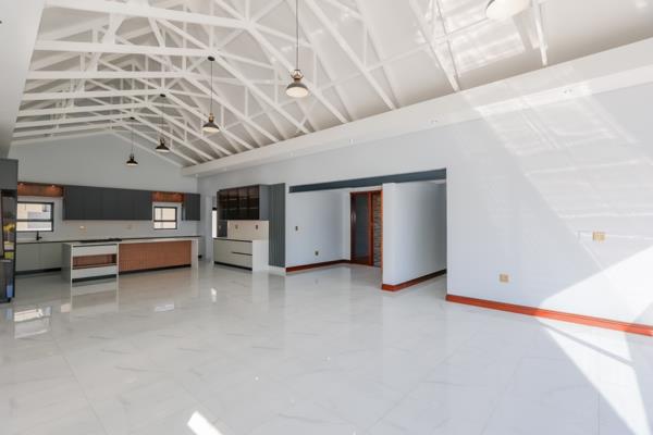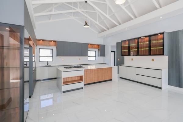 High-end finishes, vaulted ceilings, and abundant natural light create an unforgettable first impression and is visually striking. The entrance hall opens to a large open-plan living area, which includes a dining area, lounge, entertainment area and kitchen. An island and breakfast bar in the kitchen offers an inclusive atmosphere where you can prepare meals for your loved ones and enjoy their company simultaneously.