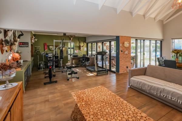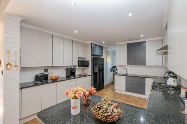 The high-end kitchen features a breakfast bar, gas hob and a scullery with ample space for your laundry appliances. Face-brick feature walls and vaulted ceilings in the living and dining room area provide a modern rustic feeling. Stack doors open to the covered braai area with a sink and built-in counters, creating a wonderful indoor-outdoor lifestyle. The large pool offers fun all year round with a solar heat pump.