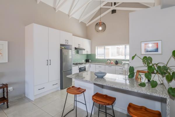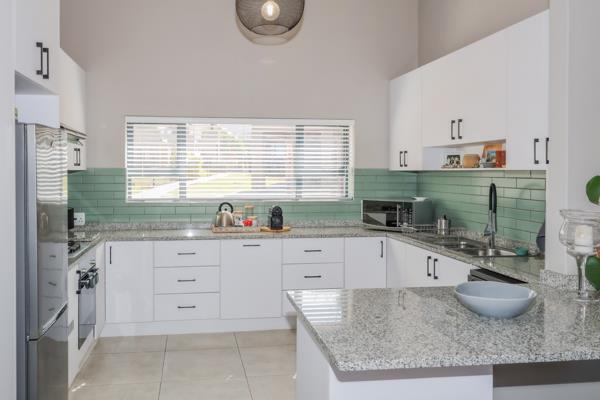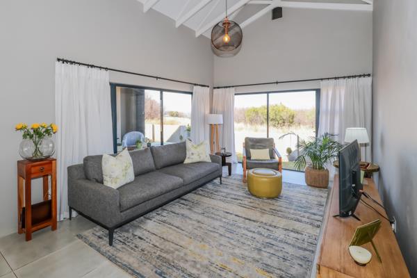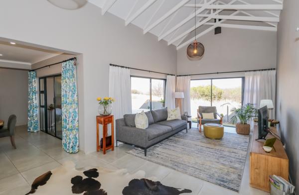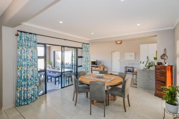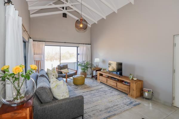 Modern Bushveld Retreat with Dam Views in Leloko. The perfect lock up and go! This modernly designed home features an open-plan layout. The stunning kitchen, offering ample cupboard space, effortlessly flows into the open-plan lounge and dining area. Vaulted ceilings gives an open and spacious feeling. Sliding doors from both the lounge and dining room open onto the braai area, offering uninterrupted views of the bushveld and Hartbeespoort Dam. The braai area is fitted with Trellis security doors and adjustable louvre awnings, allowing for both safety and versatile outdoor living.