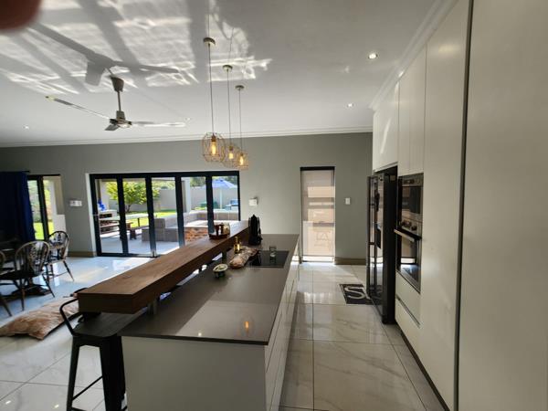 From the moment you enter, youre welcomed into spacious open-plan living areas that flow seamlessly from the kitchen to the dining and lounge spaces, creating a warm, airy ambiance. The gourmet kitchen complete with a scullery is perfect for culinary creations, while the braai area and boma set the stage for unforgettable gatherings under the stars.