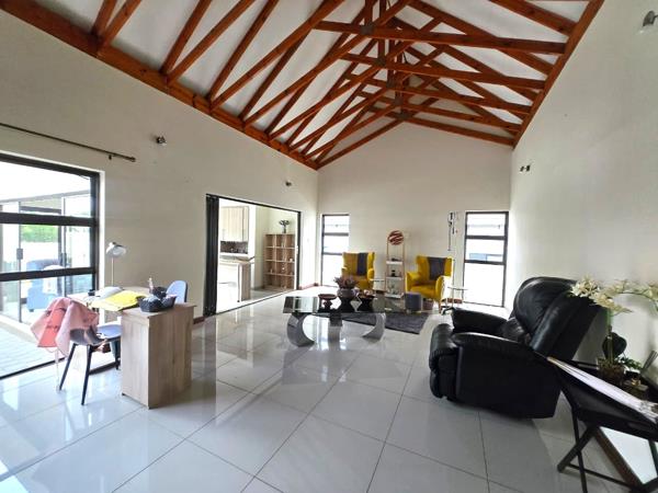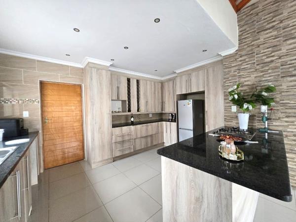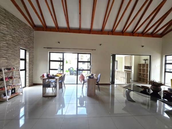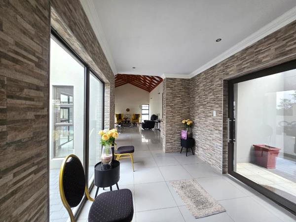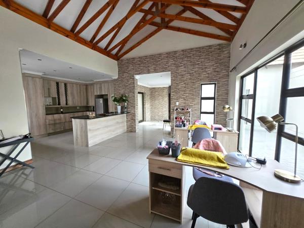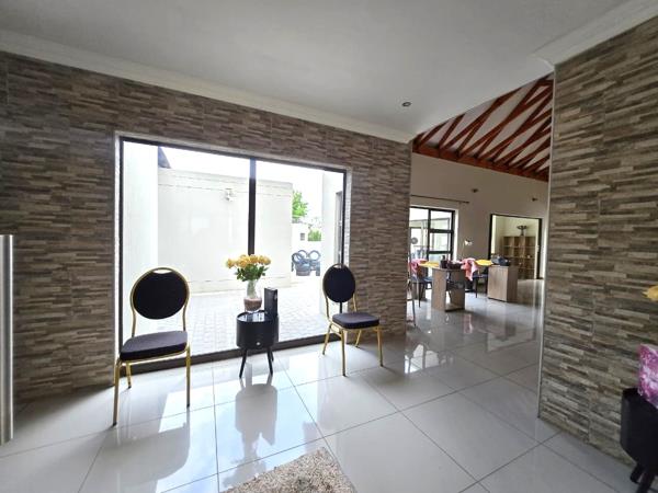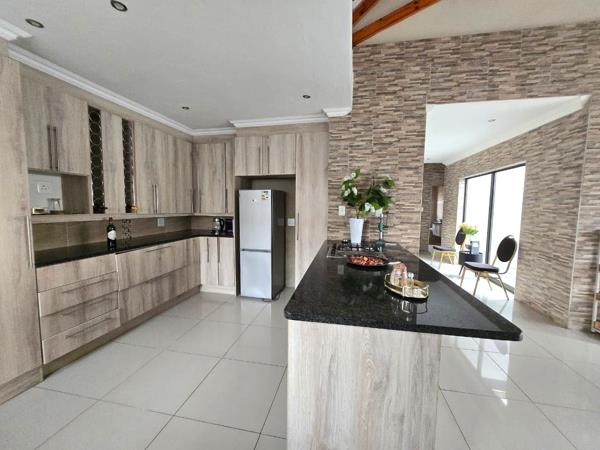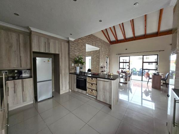 The open-plan kitchen seamlessly flows into the dining and lounge areas, creating a welcoming space for family living. An inviting entertainment area with a built-in braai makes hosting effortless, while the entrance hall adds a touch of elegance upon arrival.