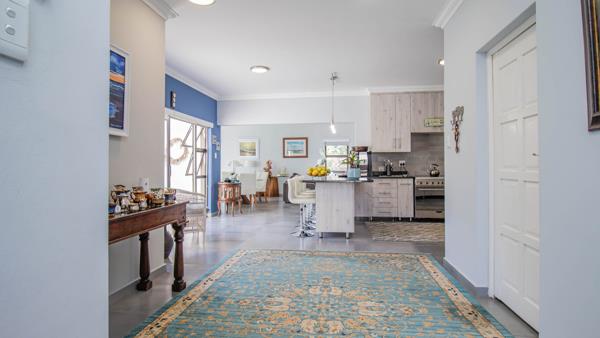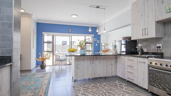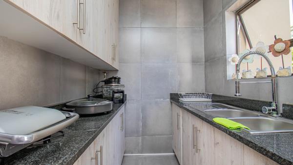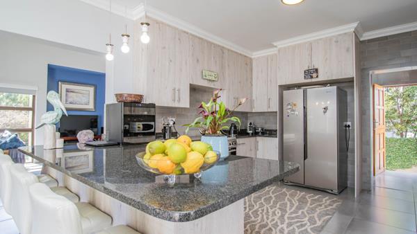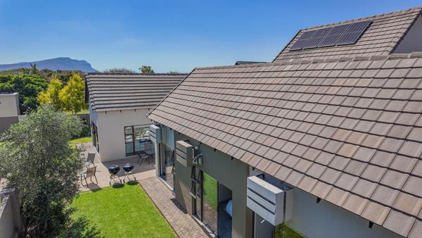 The modern open-plan kitchen is complemented by a separate scullery and laundry area, ensuring convenience and functionality. The main bedroom features a luxurious en-suite bathroom, walk-in cupboard, and sliding doors that open directly onto the lush, manicured garden. Two additional well-sized bedrooms, also with sliding doors to the garden, share a stylish second bathroom.