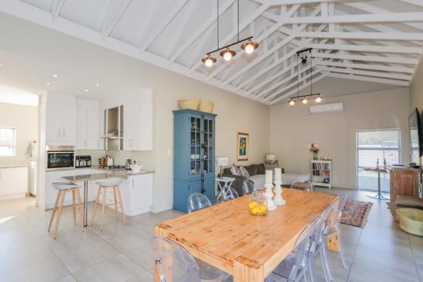 The entrance hall welcomes natural light and your guests through the front door, while separating the bedrooms to the right, from the living area to the left. The open-plan kitchen features a gas hob, breakfast bar and a scullery, while the lounge and dining area has vaulted ceilings for a spacious feel and stack doors opening to the outdoor entertainment area and a luscious lawn.