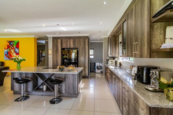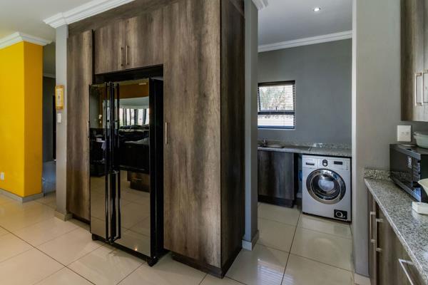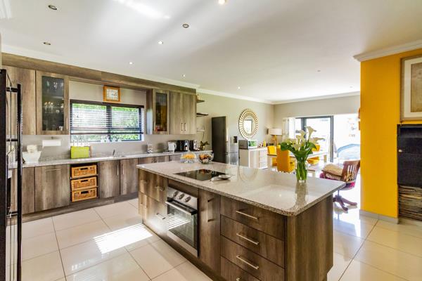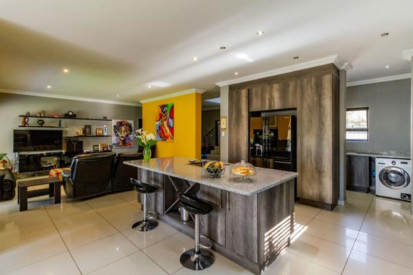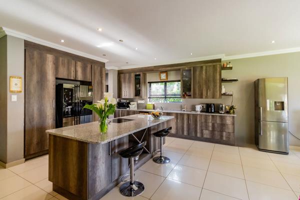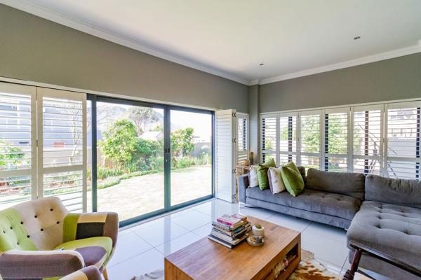 An inviting entrance hall leads to the open-plan living area with a fireplace at the centre. The kitchen has ample cupboard and counter space, a breakfast bar and a scullery. Spacious enough to accommodate a lounge, dining room, and indoor entertainment area, the living space overlooks the beautiful backyard. American shutters and sliding doors open wide to let in natural light and fresh air, while a guest toilet conveniently completes the downstairs area.