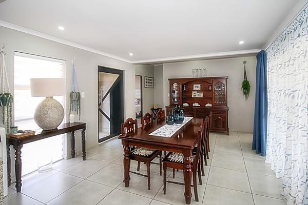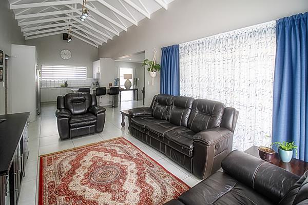 The spacious main bedroom has an en-suite bathroom. After a long day, one can relax on the covered patio with a built-in braai, overlooking the mountains. The extra-length garage provides ample space to accommodate the laundry at the back. There is also covered parking in front of the garage. The garden is well-maintained, and big enough for a small dog.