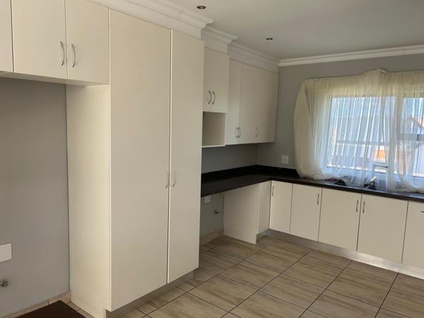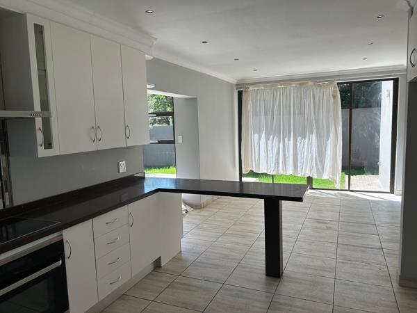The open-plan kitchen is spacious and modern, equipped with an electric hob and extractor fan, and flows effortlessly into the adjacent dining area, ideal for relaxed family meals and entertaining. The lounge is air-conditioned and opens via sliding doors onto an open patio with a built-in braai, perfectly positioned to enjoy the peaceful garden and green belt setting.
