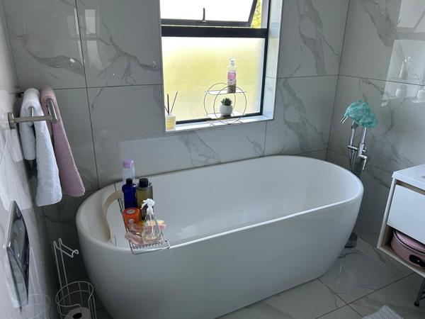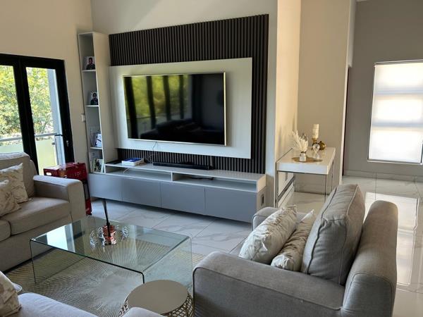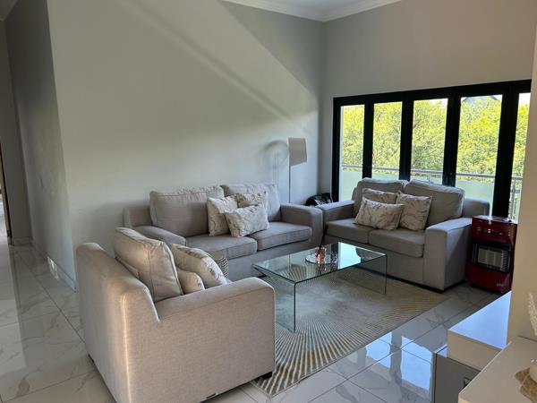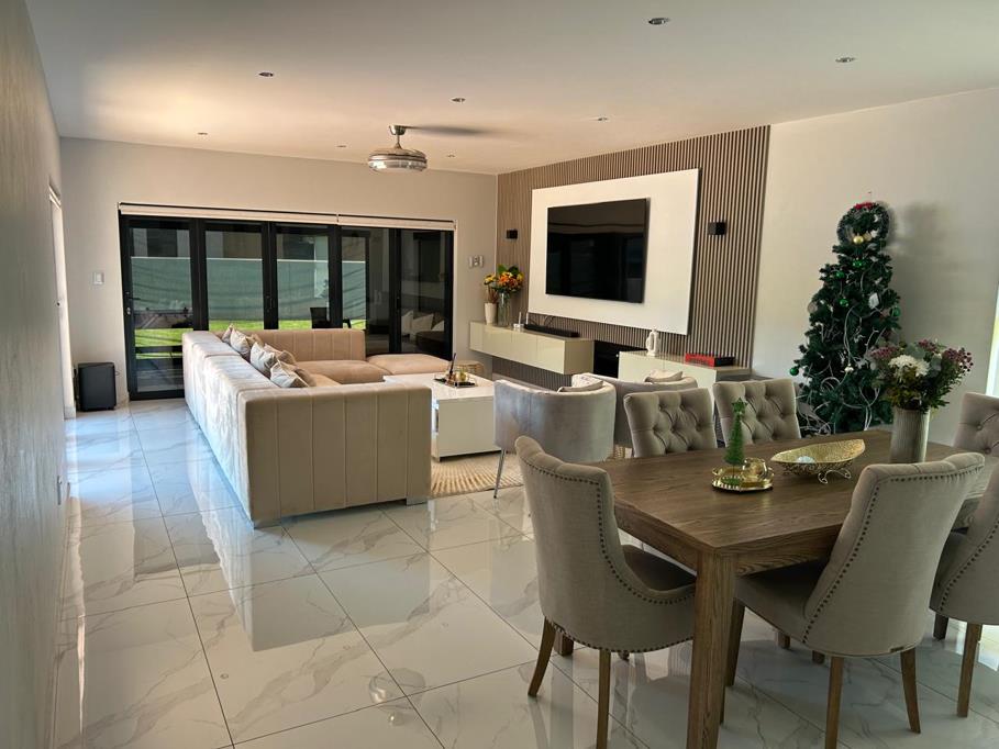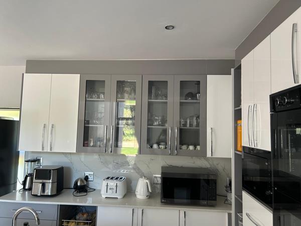 A large entrance hall welcomes you into the home, complemented by a guest toilet for added convenience. The spacious open-plan living area flows seamlessly into a well-finished modern kitchen offering ample cupboard space and a separate scullery, keeping the main living area neat and uncluttered.