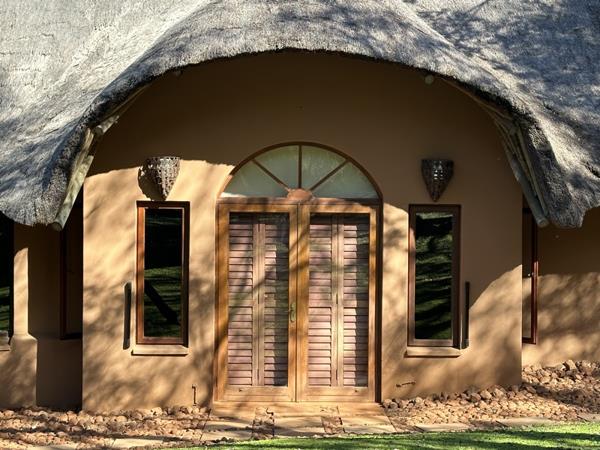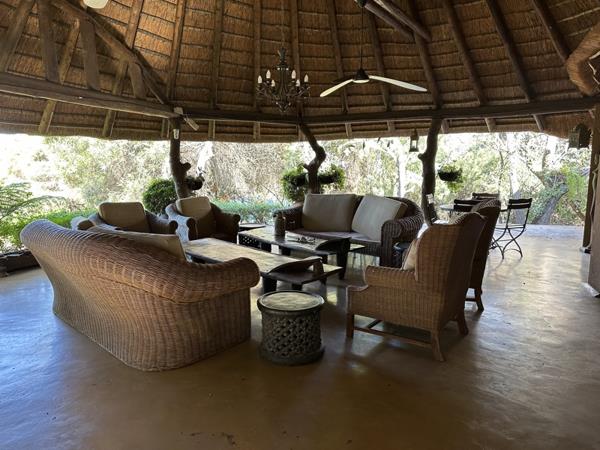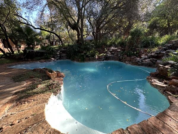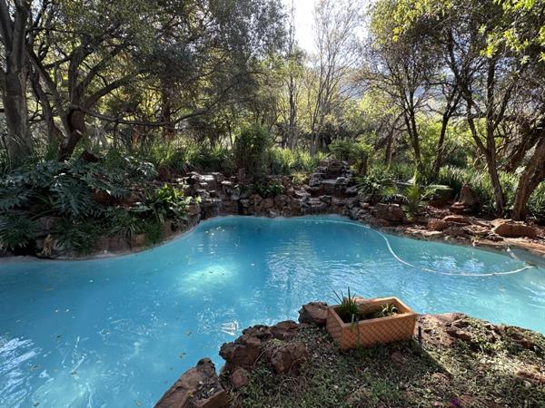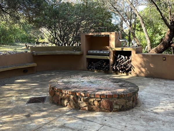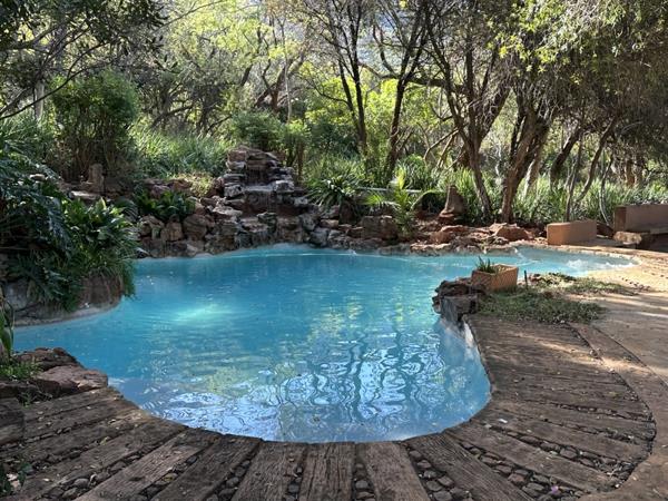 Every detail in this home is style appropriate following a designer safari theme. The highly polished screeded floors have stone décor, the doors are imported and many carved and some with sand blasted glass. All areas are spacious including a massive circular lounge with an open fireplace leading onto a truly Out of Africa veranda with views of the dam. The patio also overlooks a huge Koi pond with several small waterfalls. The adjacent pool is magnificent and blends into the natural environment also with 3 water features. Not to mention a large boma with gas braai surrounded by tropical plants.