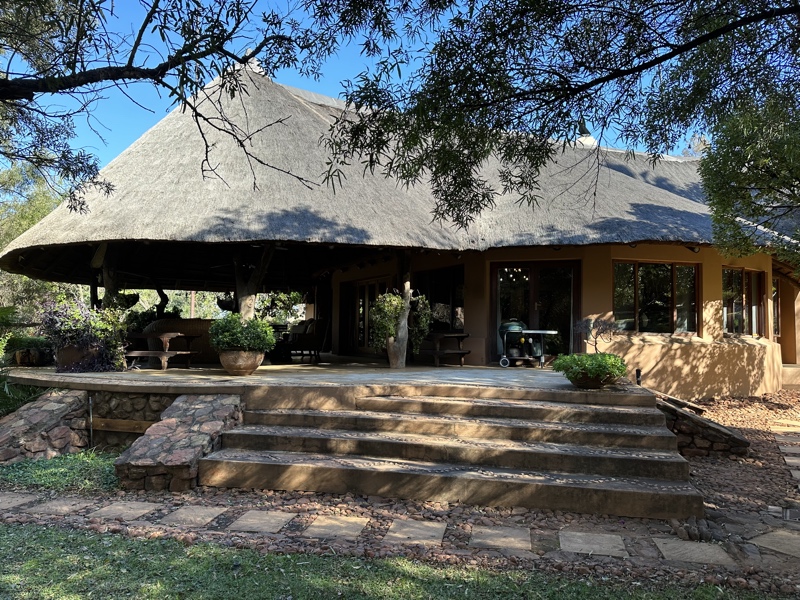 Authentic African designer home set on 50 hectares of Bush going up the Magaliseburg mountains with breathtaking views of the dam and surrounded by wildlife.