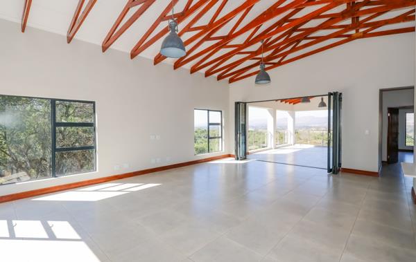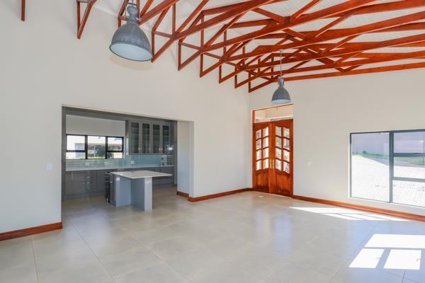 The front door opens to a naturally lit open-plan living area. Built practically to suit all your needs, high-end finishes in the kitchen, a gas hob, breakfast bar and scullery, make this a very convenient cooking space. A large lounge and dining room area open to the covered patio and braai area, separated by stack doors so that you can enjoy two areas or one big space.