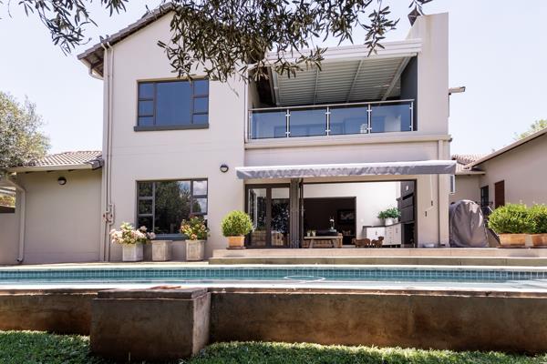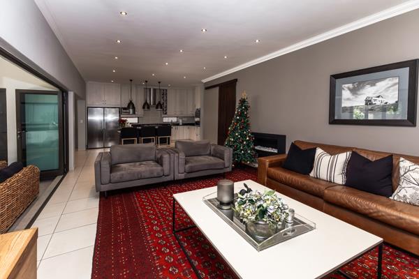 The open-plan living area features an air-conditioned lounge with a gas fireplace and elegant blinds, flowing through stacking doors to the enclosed braai room. From here, more stacking doors open onto the sparkling pool, creating the perfect indooroutdoor entertainment setting.