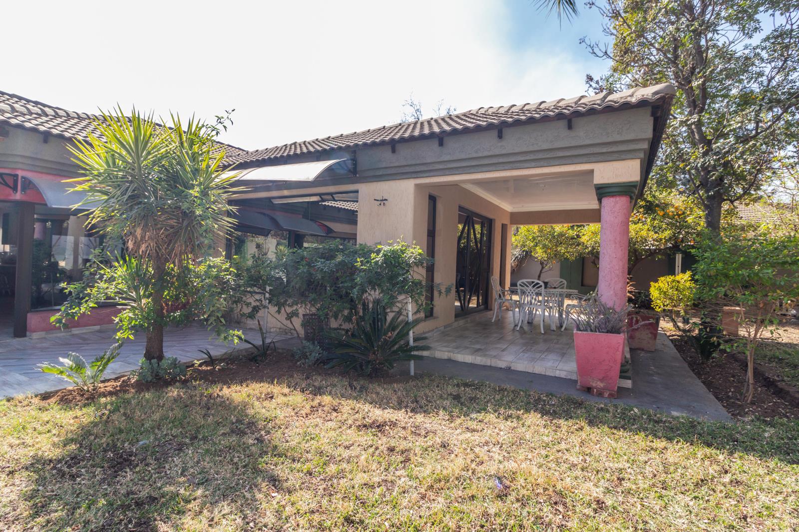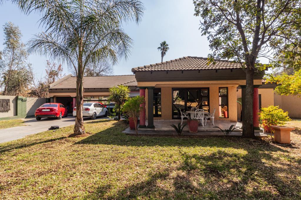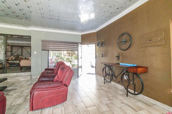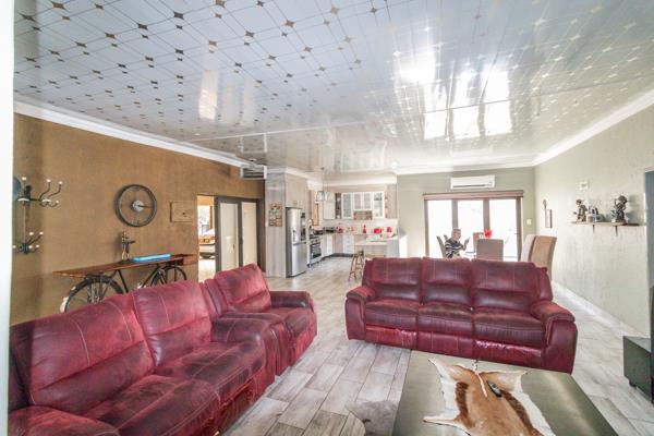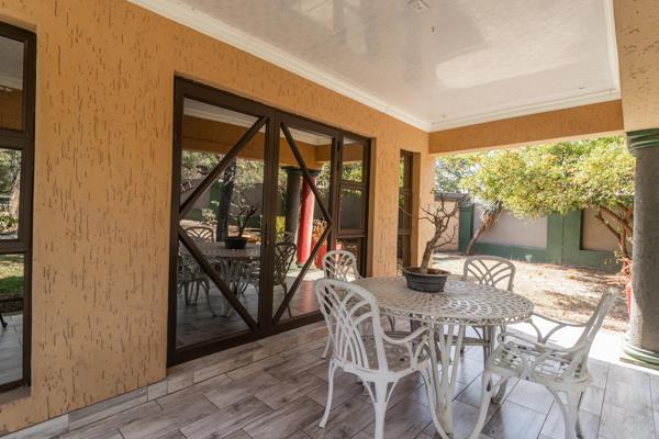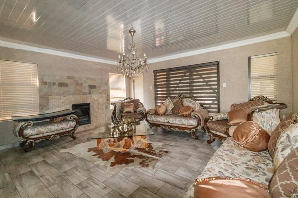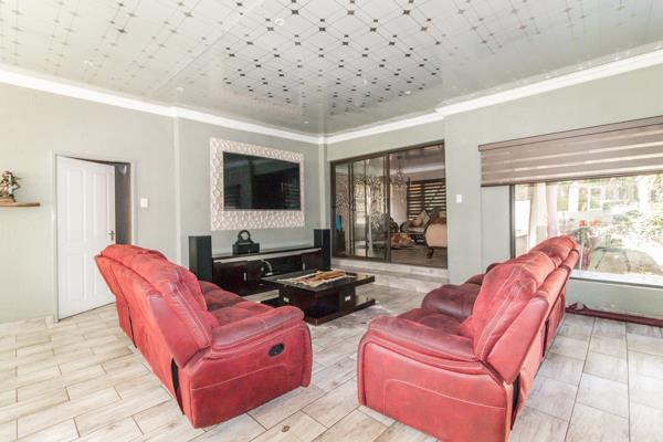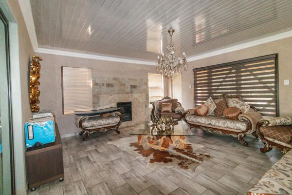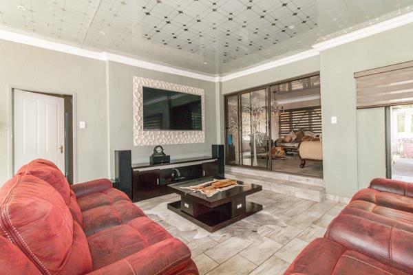 The spacious lounge area is perfect for relaxation, while an additional living area, complete with a built-in braai and a beautiful chandelier, provides a sophisticated space for entertaining guests. The home boasts elegant tiled floors throughout, complemented by air conditioning and intricate roof detailing that add to its charm.