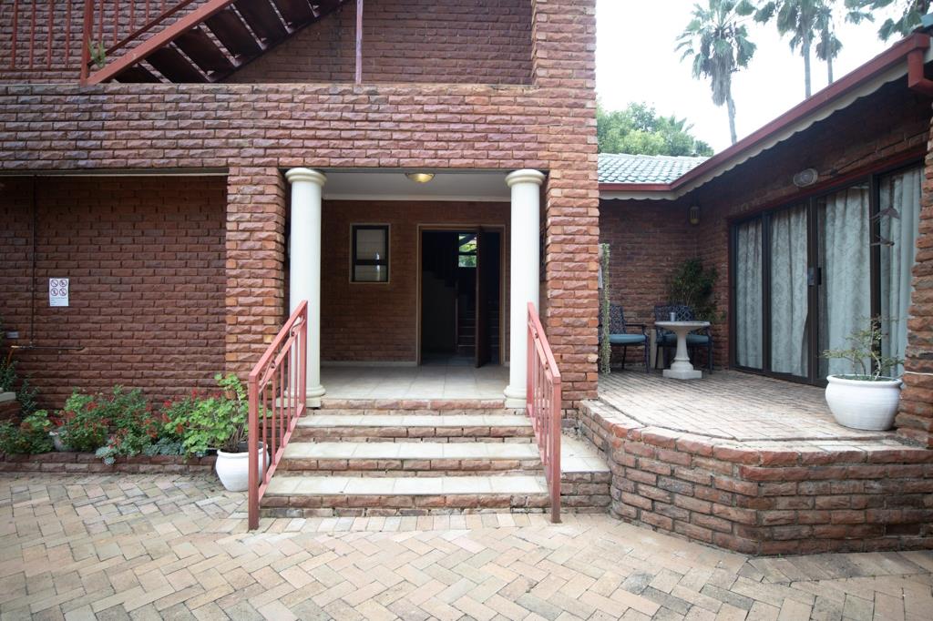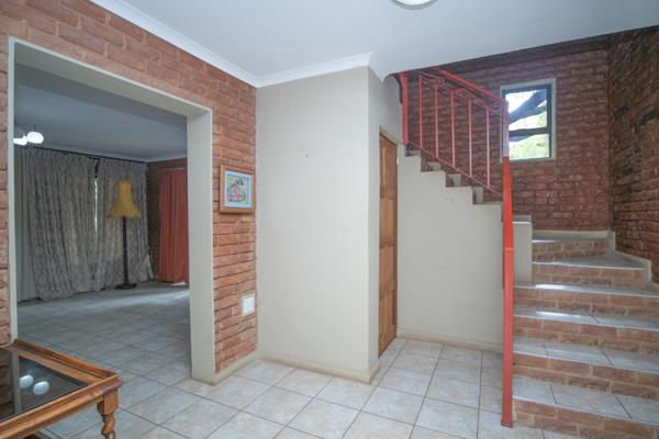 Upstairs, an open study with a cozy fireplace offers breathtaking views of the Magaliesberg mountains. A staircase leads to a private treetop deck, the perfect spot for sunbathing in complete privacy. The three bedrooms are spacious, each with modern built-in cupboards, while the main en-suite bathroom has been elegantly renovated with contemporary finishes.