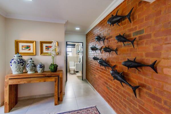 Upon entering the stylish entrance hall, you are welcomed by a feature wall that immediately sets a tone of sophistication. To the left, youll find access to the double garage, complete with additional built-in cupboards as well as a conveniently located guest bathroom.