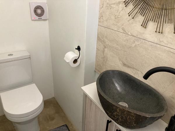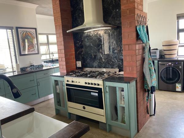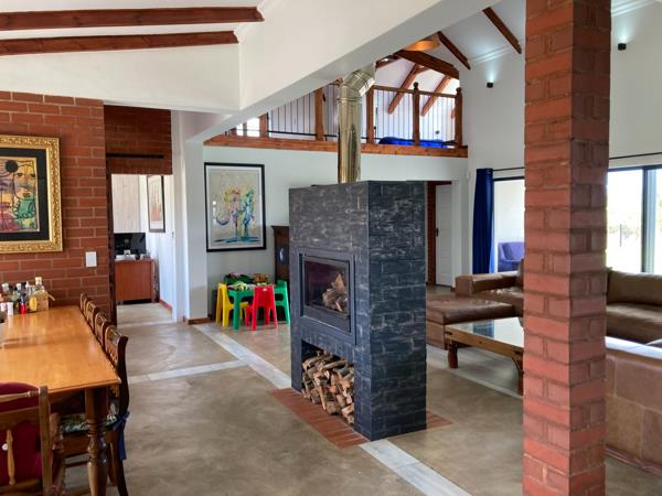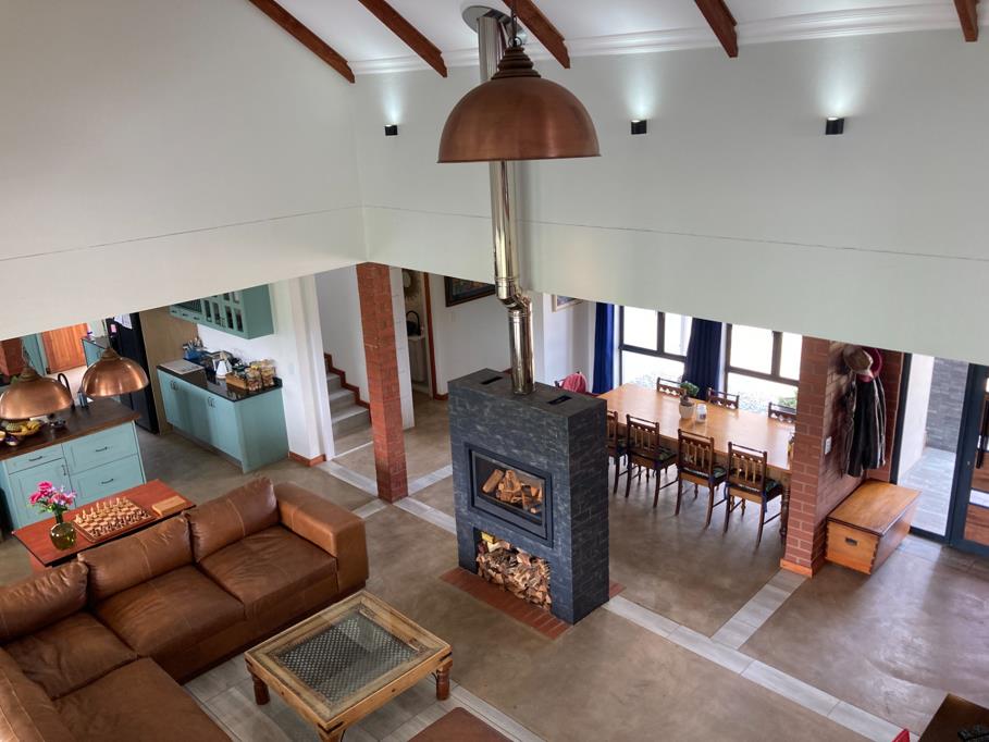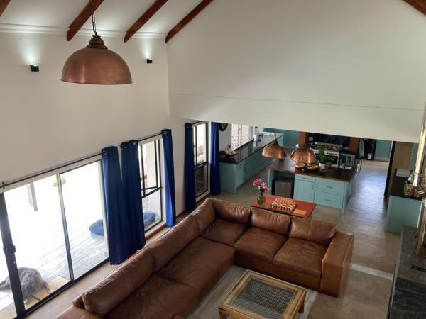 This stunning 462 m residence is set on a 1391 m stand. As you enter you are met by a double volume living area that walk out onto the patio, pool and massive yard. On the ground floor is the modern kitchen, scullery, dining and lounge area with wooden fire, dining room, study, separate guest toilet, guest bathroom with its own gas guesser, bedroom as well as area where you walk up to the loft suited for a second study, playroom or second sitting room. 3 of the 4 bedrooms, are upstairs and have a balcony. The main bedroom has a full en-suite bathroom and the other bedrooms share a full bathroom. Bathrooms have natural stone basins and the main bedrooms bathroom has a stonecast bath. Outside the kitchen you will find, as a bonus, a full bathroom.