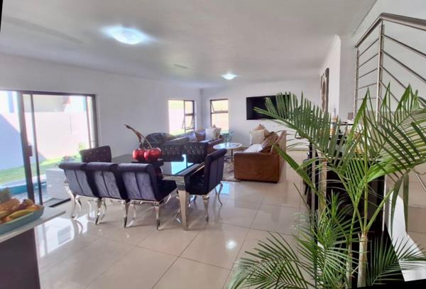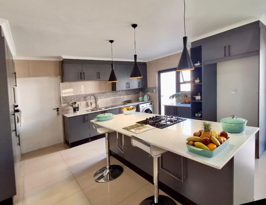 The spacious open plan layout features a modern kitchen with dark grey cabinetry, a large island with gas hob and sleek tiled flooring that flows effortlessly into the dining and living areas. The living space is filled with natural light and fitted with airconditioning for year round comfort, creating a warm and living atmosphere for family and guests.