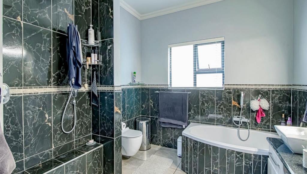 The master suite is a private retreat, complete with a walk-in wardrobe and a luxurious en-suite bathroom offering dual vanities, a freestanding bathtub, and a rainfall shower. Three additional bedrooms are generously sized, ideal for children, guests, or a home office.