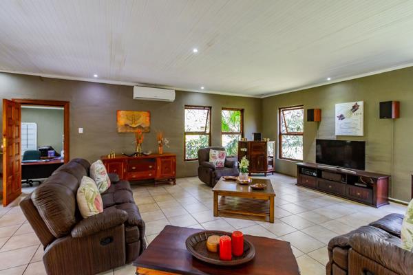 A separate home office, which can also be utilised as an additional cottage, offers two bedrooms, an open-plan living area, a kitchen, and two bathrooms, making it an ideal space for a guesthouse, rental opportunity, or extended family living.