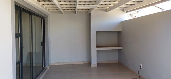Living room with sliding door opens unto an open patio with built-in braai.