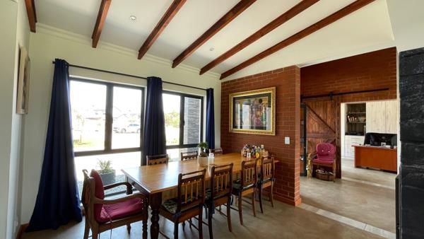 Open plan kitchen and scullery, dining and lounge are with a double-sided Fireplace. Sliding doors in living area open up to the patio and braai area with northern mountain views.