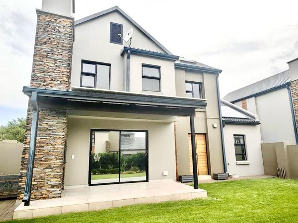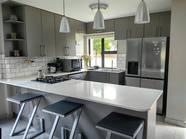 This modern open-plan apartment is spacious, with contemporary finishes and seamless flow between rooms. The living area is equipped with an efficient air conditioner, ensuring comfort year-round, and opens up to a generously sized patio via sleek, sliding aluminum doors. This outdoor space includes a built-in braai area, perfect for entertaining or enjoying a casual outdoor meal. A double garage provides secure parking and extra storage space, while a small, private garden offers a touch of greenery, ideal for outdoor relaxation or gardening.