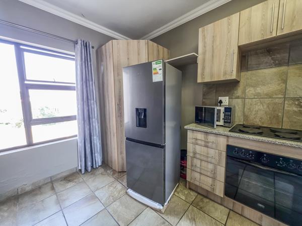 Step into a bright and airy open-plan living area, seamlessly flowing into a well-equipped kitchen featuring ample cupboard space, a built-in oven and hob, and stylish finishes. The lounge opens onto a private balcony, perfect for morning coffee or sundowners with a view.