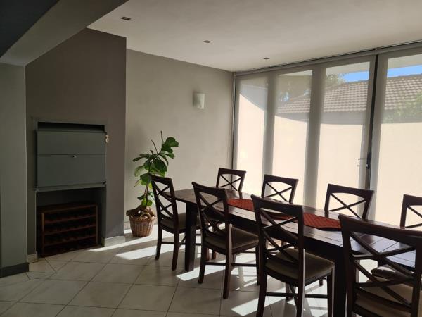 Open living space flowing to fully enclosed patio with built-in-braai and for the lovely summer evenings there is a second open patio upstairs, also with a built-in-braai overlooking the well established garden.