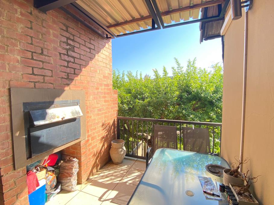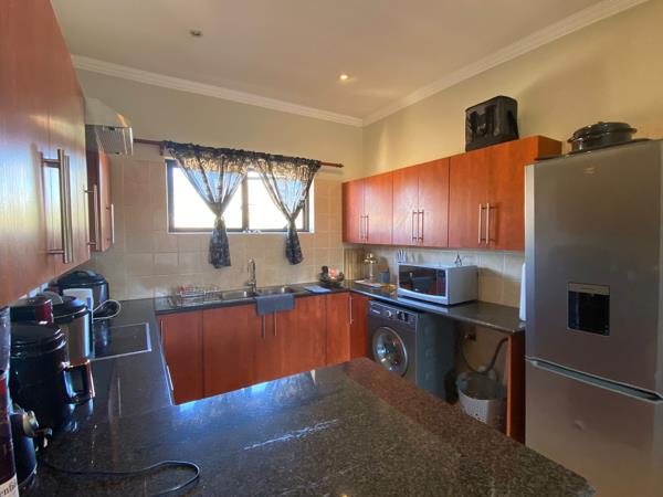 This top-floor apartment in the Symphony Park complex offers a convenient and desirable location. The open plan design of the tiled lounge and dining area creates a spacious and inviting atmosphere. The kitchen features modern amenities, including granite countertops and space for two appliances. The apartment comprises two bedrooms with built-in cupboards, which share a full bathroom. Outside, the private patio includes a built-in braai, perfect for outdoor entertaining. The property includes a double garage and an additional open parking space. With its north-facing orientation, the apartment enjoys plenty of natural light, making it a bright and cheerful living space.