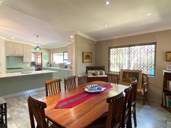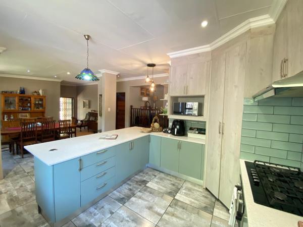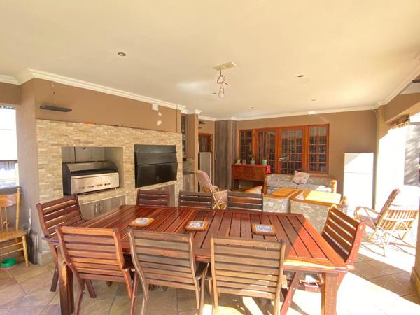 The kitchen seamlessly connects to the dining room and lounge, which boasts a fireplaceperfect for those chilly winter nights, a separate family room is also available. Sliding doors open onto an undercover patio with a built-in braai, providing direct access to the sparkling pool and outdoor braai area, offering endless options for hosting family and friends.