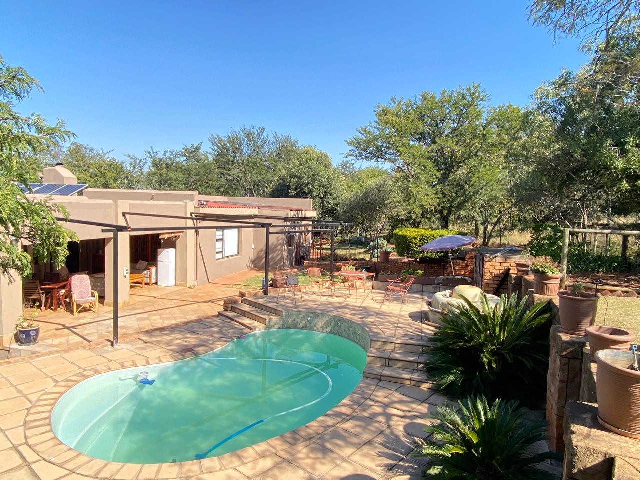 Nestled in a tree-rich environment, this charming small holding features a sparkling pool, a cozy boma area, and an outdoor braai for all your entertaining needs.