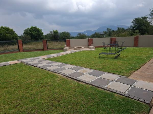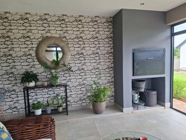 An enclosed patio with sliding doors leading to a beautiful landscaped garden, sparkling blue pool , boma and an extra entertainment area.