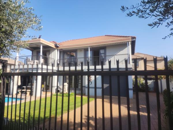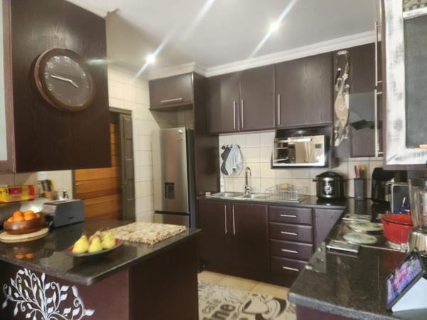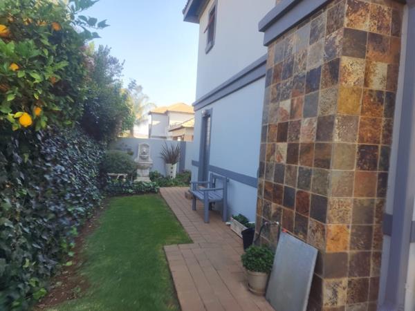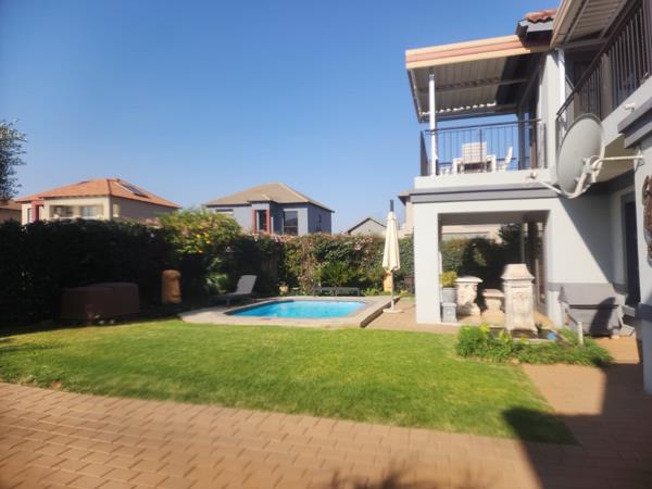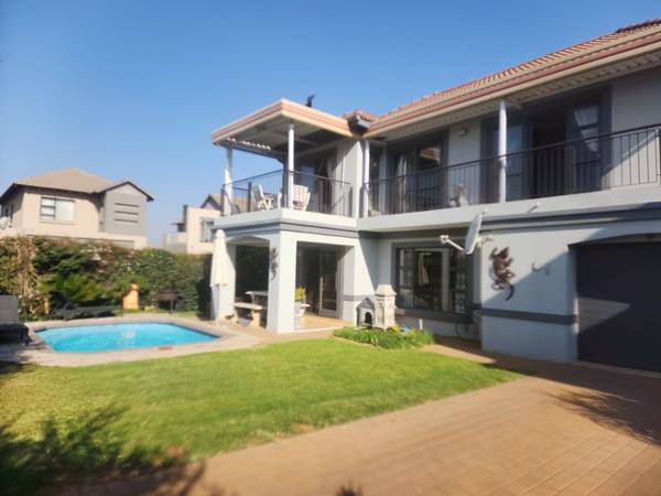 The open-plan kitchen seamlessly flows into the lounge and dining area, creating an inviting space that leads to a charming patio. Ideal for entertaining, the outdoor area includes a built-in braai and a beautifully sized swimming pool, surrounded by a manicured garden that enhances the overall appeal.