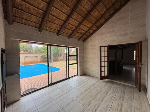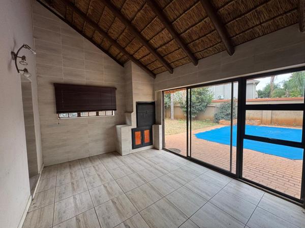 Indoor-Outdoor Flow Sliding doors lead to a cozy enclosed braai area, opening onto a large garden and sparkling swimming pool perfect for relaxing and entertaining on warm summer days.