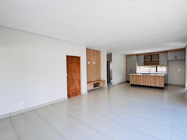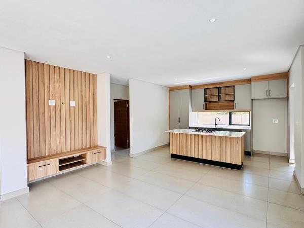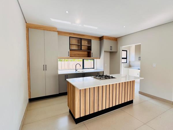 Designed for modern family living, the home features spacious open-plan living areas that flow seamlessly into a sleek, modern kitchen. The kitchen is equipped with a gas hob and its own gas geyser for added efficiency, while a separate scullery keeps the living space neat and practical.