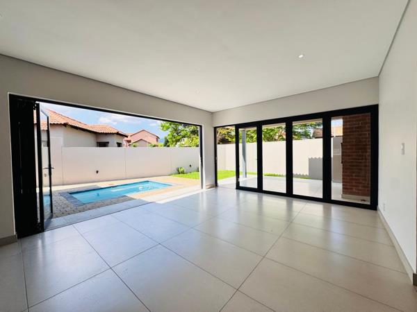 Large stacking doors open up the living area to a covered patio with a built-in braai, overlooking a sparkling swimming pool creating an ideal entertainment space where friends and family can gather and unwind.