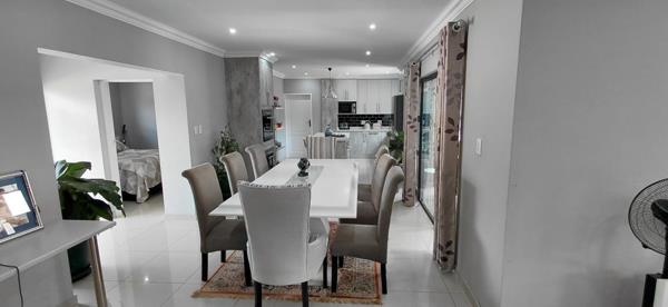 A welcoming entrance hall flows seamlessly into the open-plan dining room, lounge, and modern kitchen, complete with a separate scullery and laundry area. Expansive sliding doors connect the living spaces to an enclosed sunroom and an entertainment patio with a built-in braai, overlooking a sparkling swimming pool and a low-maintenance garden.