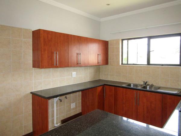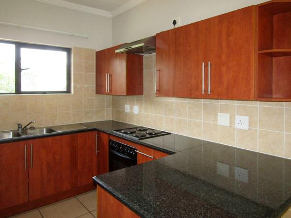 The unit offers open-plan living spaces designed for comfortable everyday living. The modern kitchen is fitted with cherry wood cupboards and offers ample space for all appliances. The lounge extends to a private balcony complete with a built-in braai, ideal for relaxed entertaining or unwinding after a long day.